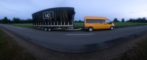 Mobilās skatuves konstrukcija veidota uz piekabes bāzes: tās transportēšanas izmēri – buss + 6 vai 8 metri piekabe.